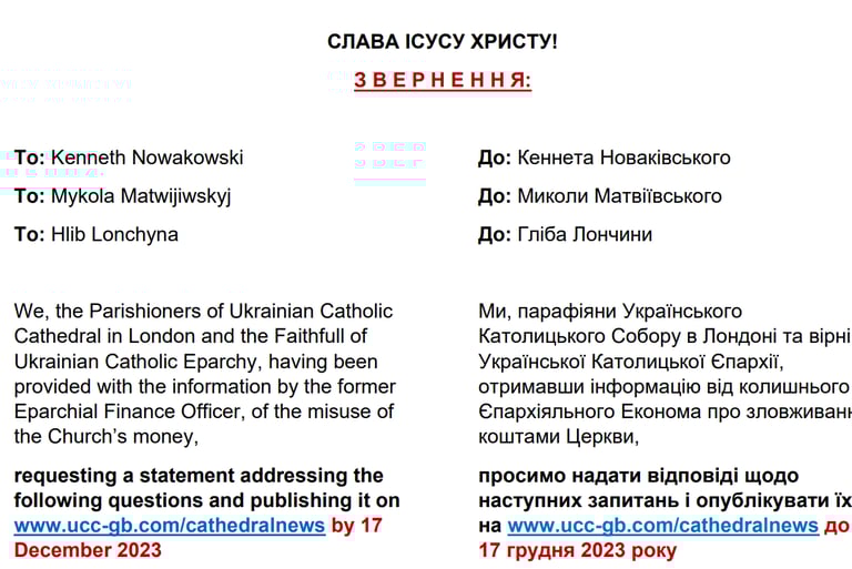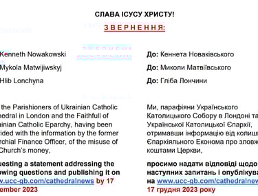 Лист від Парафіян до патріарха Святослава від 25 Січня 2022. Жодної відповіді не отримано.