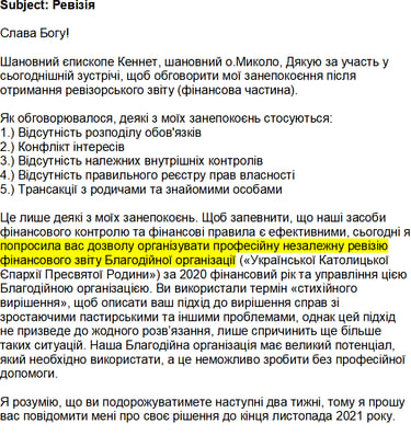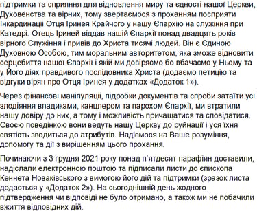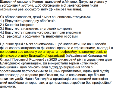 Прохання Економа Єпархії до Кеннета і Миколи провести професійну ревізію. У відповідь вони її звільнили скориставшись фальшивими декретами.